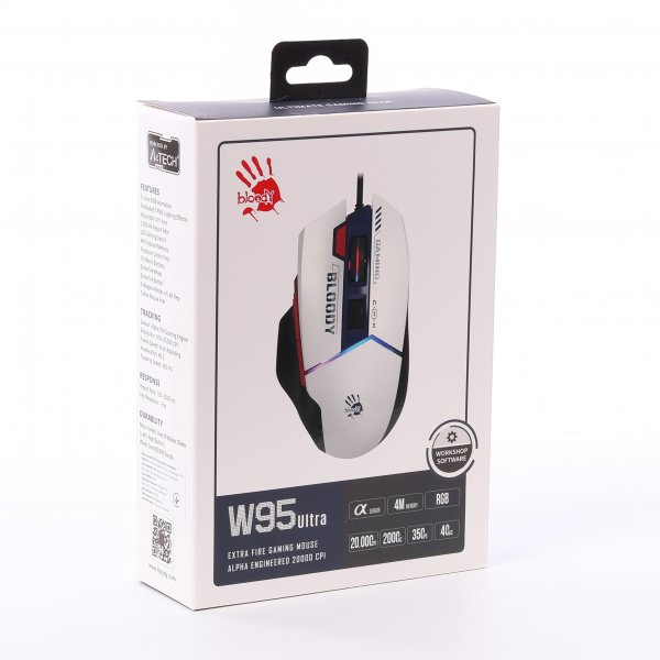 Ігрова миша Bloody, RGB, 20 000 CPI, Alpha20K, 50M натискань, біло-чорна