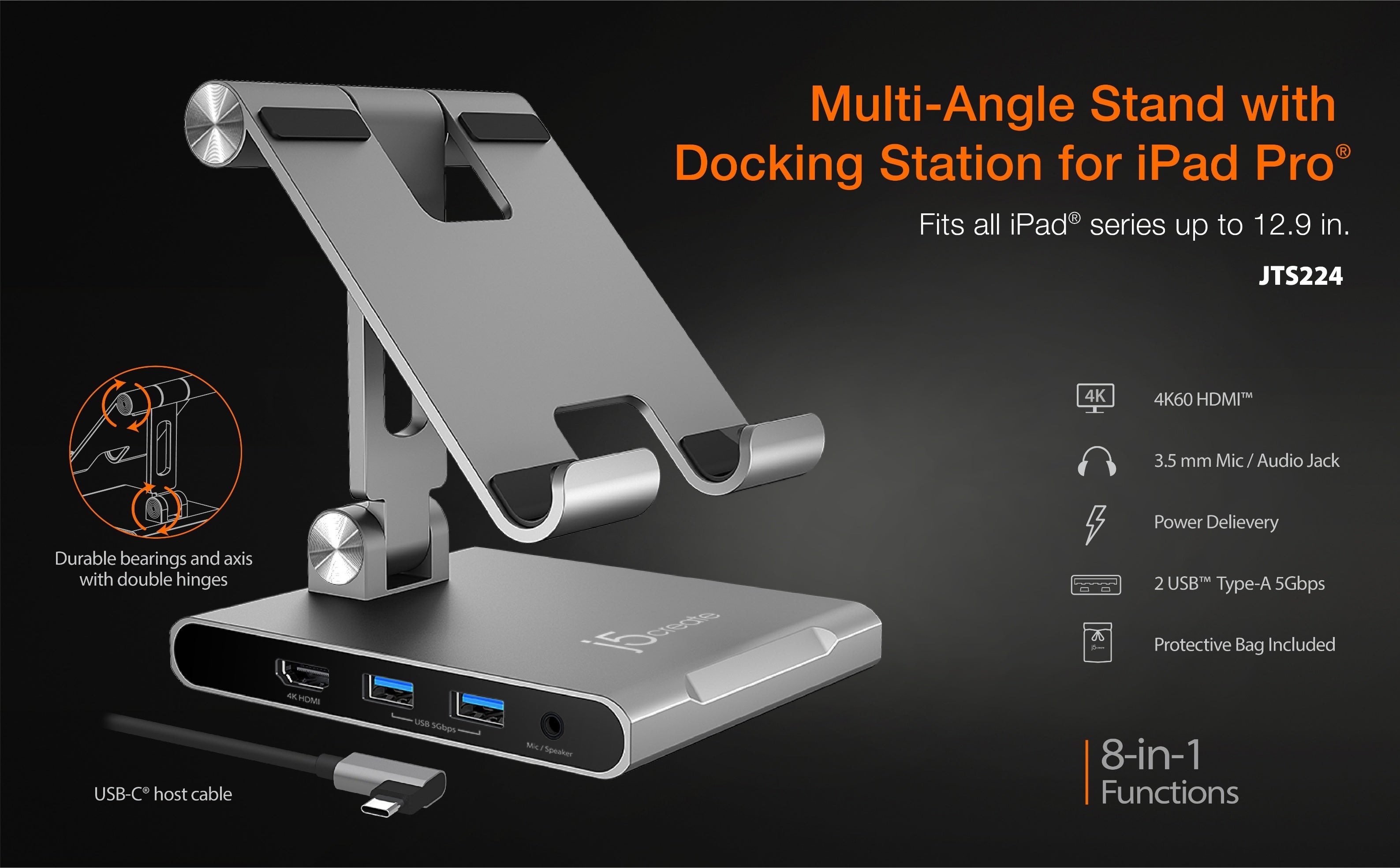- 1- Багатокутова підставка JTS224 для iPad Pro® з док-станцією