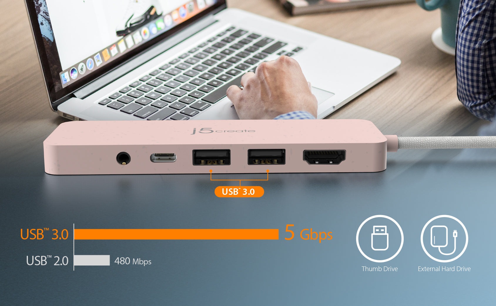 Наш екологічний багатопортовий хаб USB-C® JCD373E з функцією Power Delivery забезпечує додаткові можливості підключення для вашого комп'ютера. Цей кишеньковий мультиадаптер має 2 порти USB™ 3.2 Type-A для підключення периферійних пристроїв, таких як зовнішня клавіатура, миша або флеш-накопичувач USB™. Завдяки високій швидкості передачі даних до 5 Гбіт/с, передача даних відбувається швидко і легко. Порт HDMI™ дозволяє дзеркально відображати або розширювати екран і безпосередньо виводити 4K UHD на HDTV, монітор або проектор.