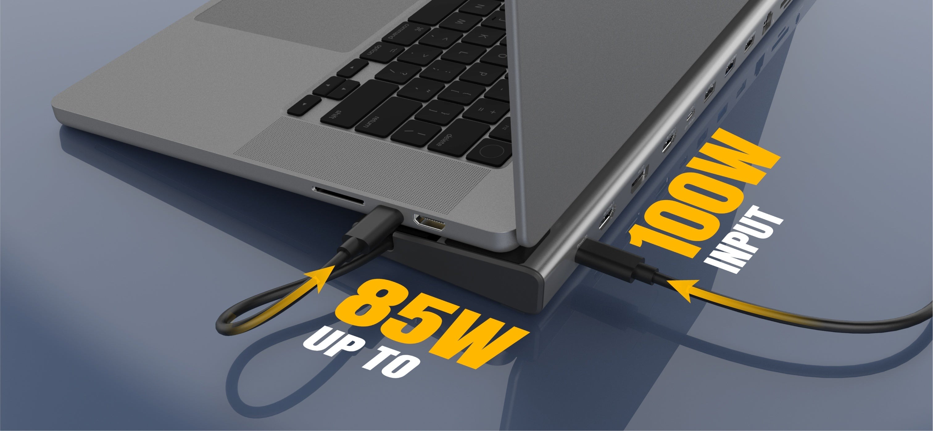 Крім того, вона має три порти USB™ 3.2 10 Гбіт/с (1 USB-C® і 2 Type-A) для заряджання або підключення периферійних пристроїв, а також порт USB-C® Power Delivery для заряджання ноутбука та підключених пристроїв із пропускною здатністю до 85 Вт. Також є порт USB™ 2.0 для підключення бездротової миші або клавіатури USB™ із зменшеною затримкою.