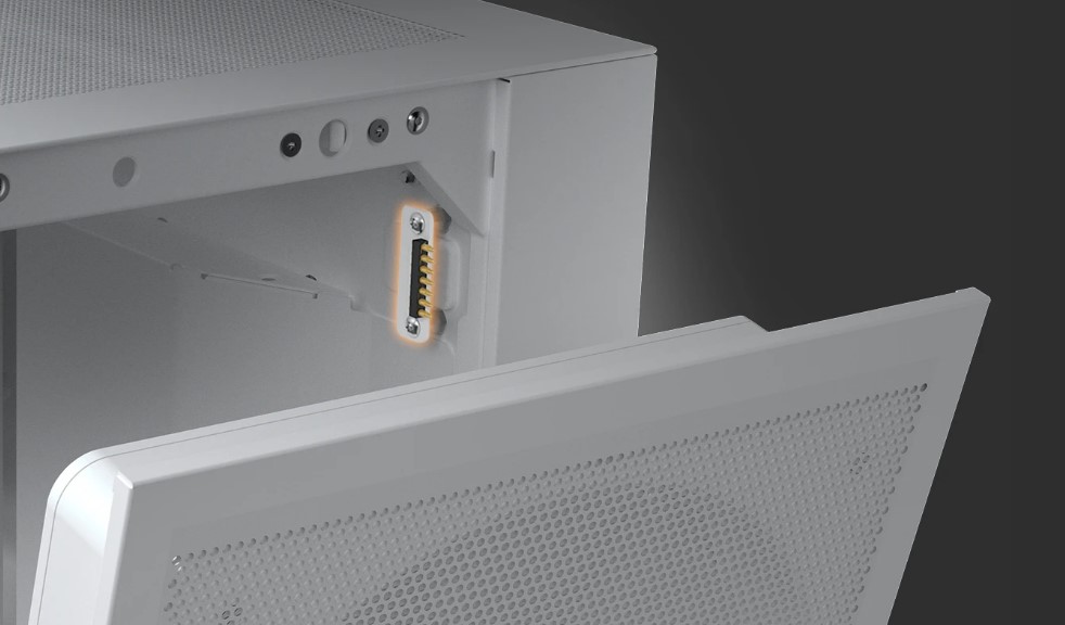 Модуль передньої панелі "3-в-1" — що об'єднує пиловий фільтр, два попередньо встановлених 160-міліметрових вентилятори ARGB PWM і сітчасту панель в один попередньо зібраний блок — дозволяє виконувати технічне обслуговування одним простим кроком. Пиловий фільтр магнітно кріпиться до рами, два 160-мм вентилятори ARGB PWM (попередньо встановлені) встановлюються в раму, попередньо прикріплену до передньої сітчастої панелі, передня сітчаста панель і попередньо прикріплена рама утворюють єдиний закінчений компонент.