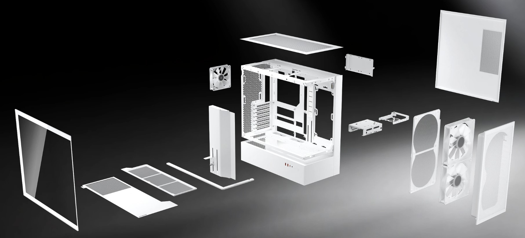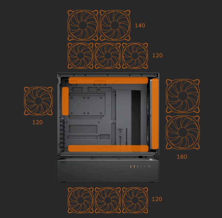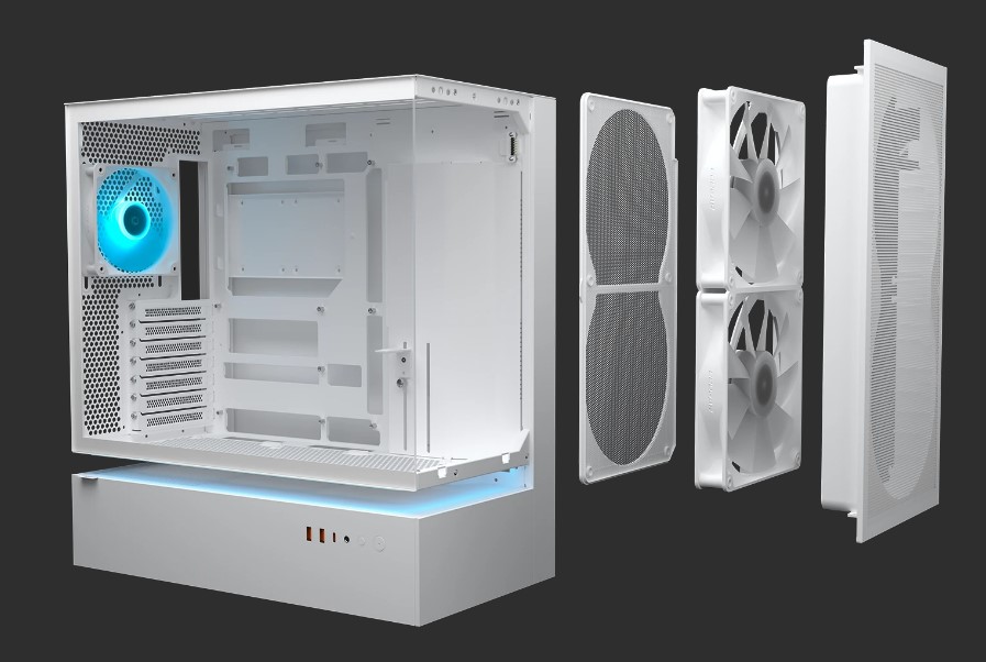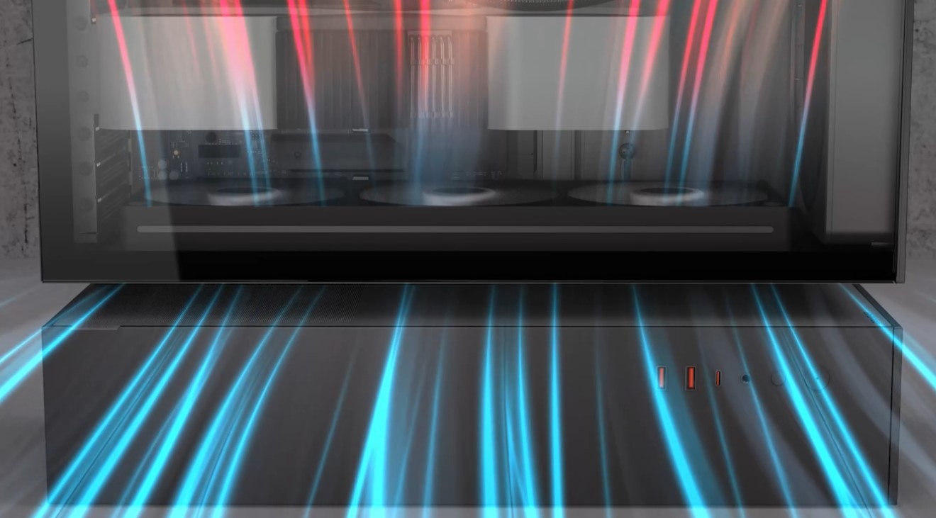 Модуль передньої панелі "3-в-1" — що об'єднує пиловий фільтр, два попередньо встановлених 160-міліметрових вентилятори ARGB PWM і сітчасту панель в один попередньо зібраний блок — дозволяє виконувати технічне обслуговування одним простим кроком. Пиловий фільтр магнітно кріпиться до рами, два 160-мм вентилятори ARGB PWM (попередньо встановлені) встановлюються в раму, попередньо прикріплену до передньої сітчастої панелі, передня сітчаста панель і попередньо прикріплена рама утворюють єдиний закінчений компонент.