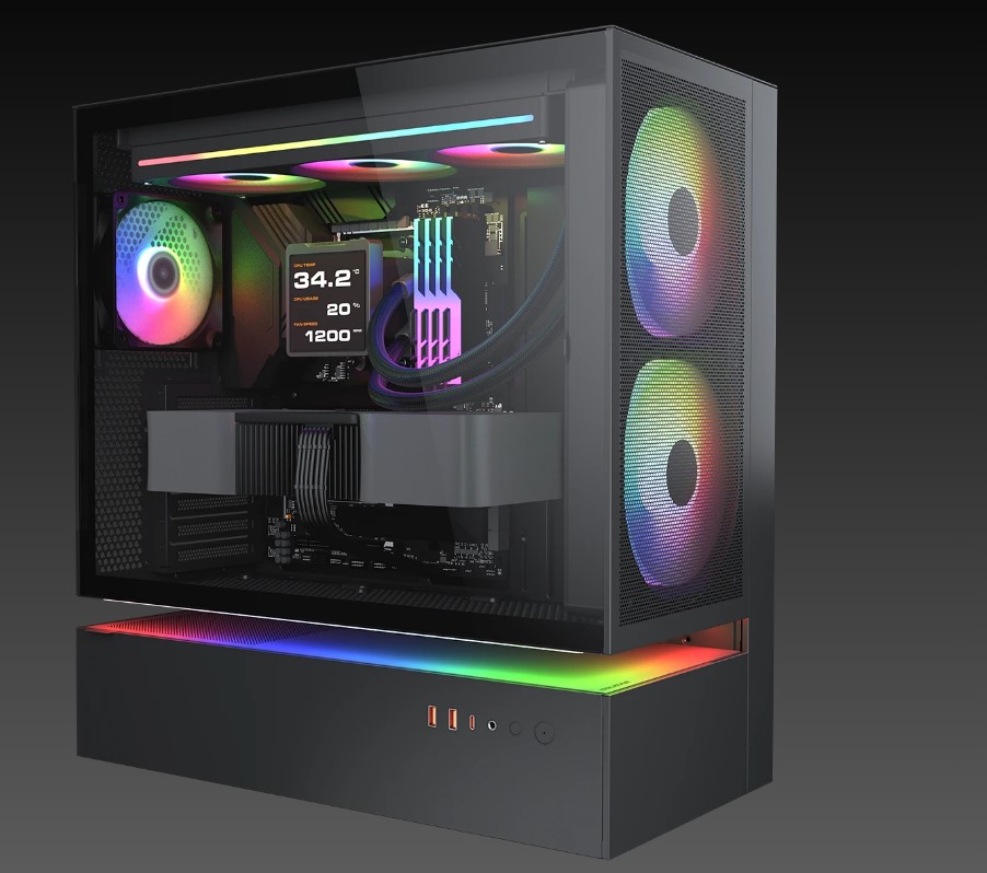 CFV235 Mesh — це новий тип корпусу для ПК з інноваційною конструкцією центральної плаваючої вентиляції (CFV). Вона розділяє відсік блоку живлення і основний відсік, використовуючи відкритий простір між ними для охолодження за рахунок додаткової вентиляції, зберігаючи компактність без шкоди для поліпшеного охолодження. У поєднанні з модулем передньої панелі "3-в-1", що об'єднує сітку, два 160-мм вентилятори ARGB PWM і пиловий фільтр в єдиному попередньо зібраному блоці, CFV235 Mesh забезпечує повітряний потік, що виходить за рамки стандартних обсягів.