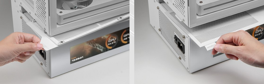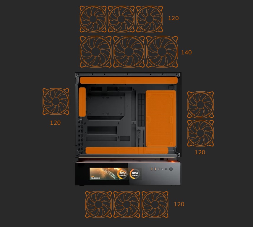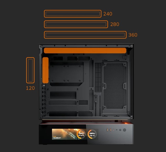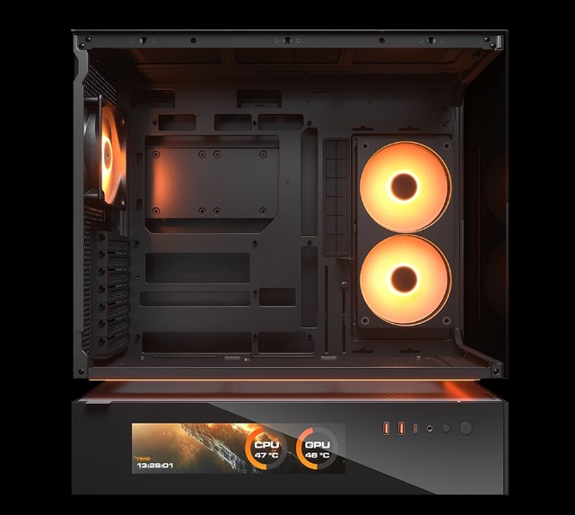 CFV235 Vision — это новый тип корпуса для ПК с инновационной конструкцией центральной плавающей вентиляции (CFV). Она разделяет отсек блока питания и основной отсек, позволяя использовать свободное пространство между ними для охлаждения и дополнительной вентиляции. Встроенный 9.16-дюймовый IPS TFT LCD-дисплей обеспечивает программный мониторинг системы в режиме реального времени с разрешением 1920×462 и частотой обновления 60 Гц, отображая критически важные данные и настраиваемые визуальные эффекты.