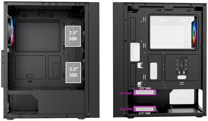 Варіанти зберігання даних універсальні: підтримка двох SSD і HDD 2х 2.5" + 2х 3.5" або конфігурація тільки з SSD 4х 2.5", що дає вам можливість розширити ємність пам'яті мірою необхідності.