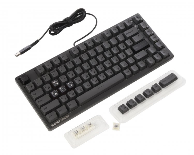 PBT геймерского класса и ABS. 4 высокопрочных PBT-кейкапа (W, A, S, D) обеспечивают цепкую тактильность и устойчивость к износу игровой зоны клавиатуры. Все кейкапы имеют матовое покрытие, которое убирает блеск и дарит прекрасные тактильные ощущения от каждого нажатия